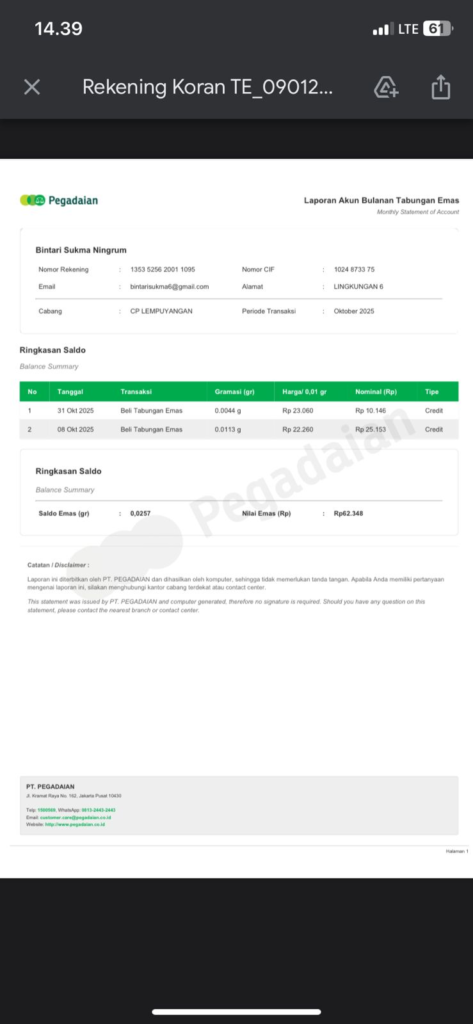 - Penutupan tabungan pada posisi saldo 1.19 gr