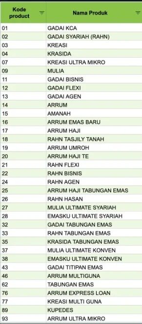 Kode produk Pegadaian yang dapat dilihat pada nomor kredit nasabah biasanya terletak pada urutan ke 8-9.